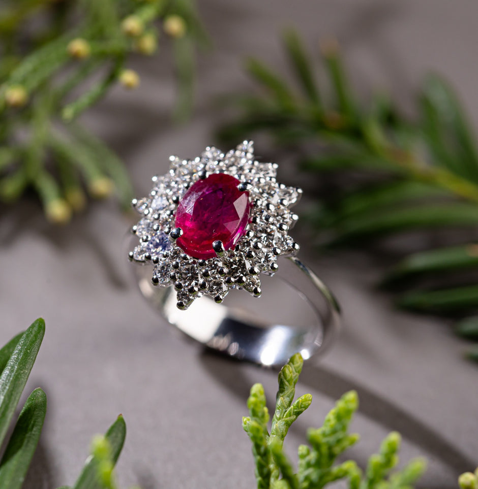Anello in oro bianco 18 Kt. con centrale in rubino birmano Ct. 1,66 e contorno di diamanti Ct. 0,96 VS F color