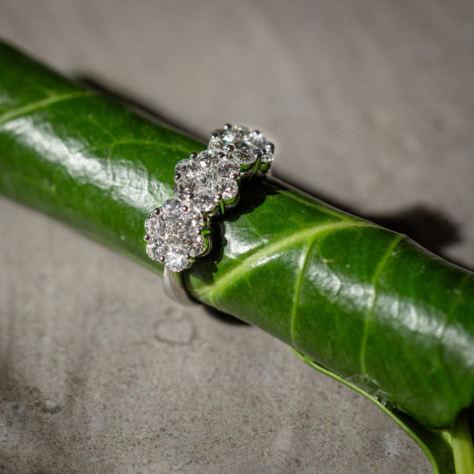 Anello in oro bianco 18 Kt. modello trilogy, struttura a rosette con diamanti ct. 2,26 VS/F