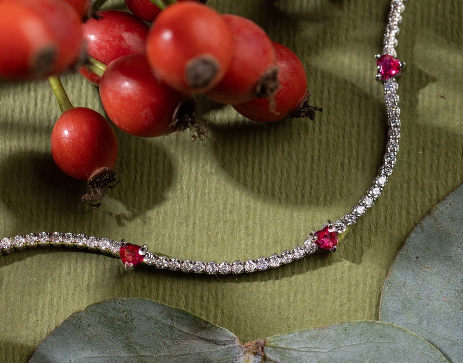 Bracciale in oro bianco 18 Kt. modello tennis con rubini birmani Ct. 1,22 e diamanti Ct. 1,83 VVS F color