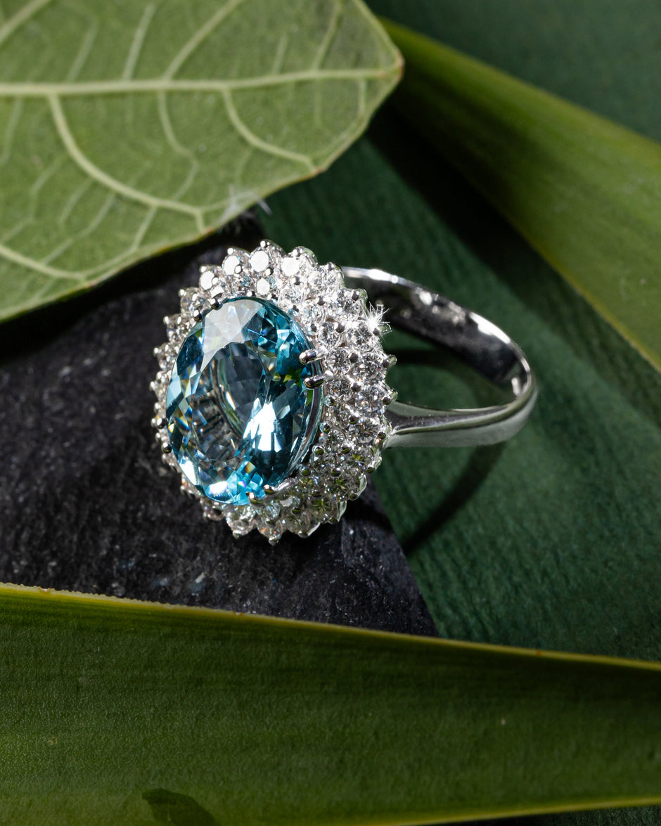 Anello in oro bianco 18Kt con acquamarina ct. 3,0 e diamanti ct. 1,10 VS/F